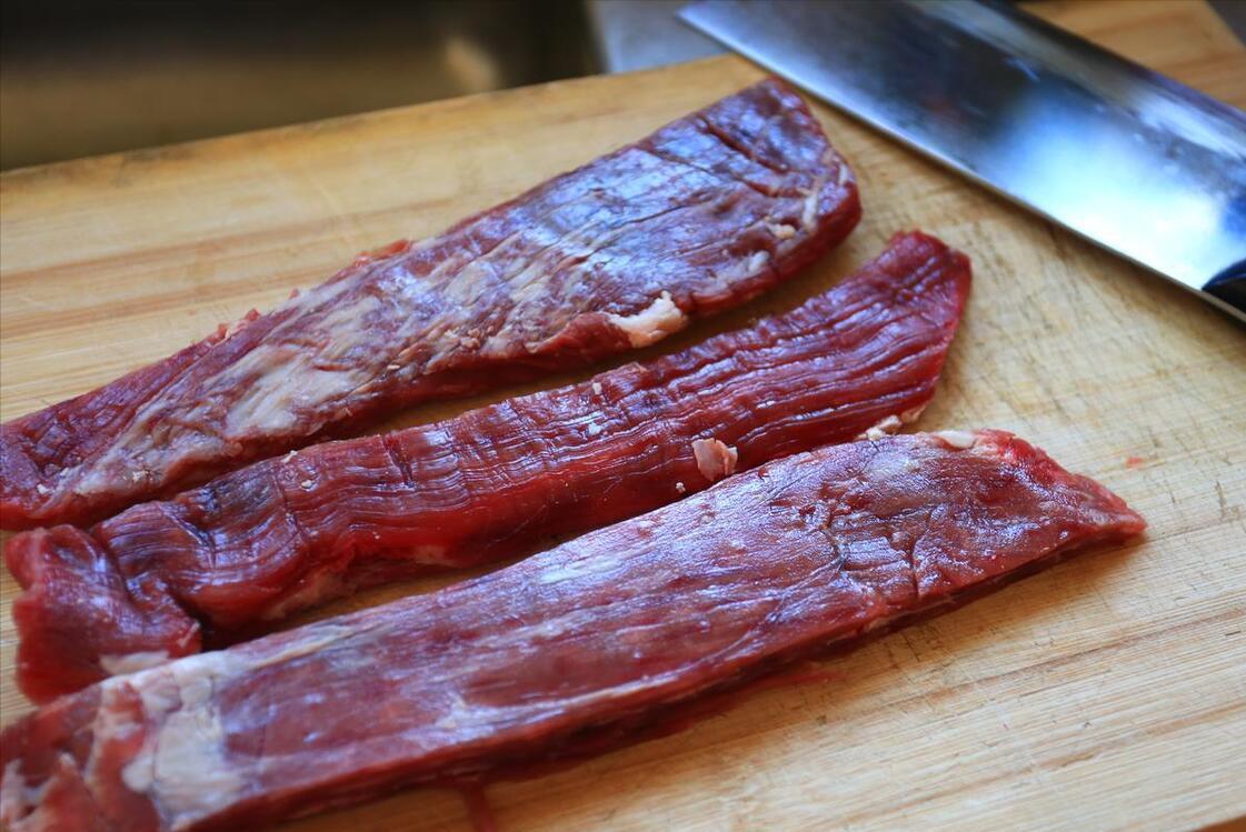 1、首先我們把新鮮的牛肉準備好,將上面的筋膜剔除以後,放入水中清洗乾淨,再將其控幹水分,切成條狀。