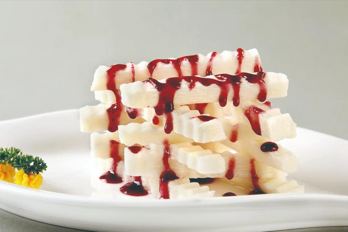 山藥清洗乾淨之後,切成小段,直接上鍋蒸,蒸好了以後取出來,咱們把上面的皮剝掉,然後將山藥捻碎成泥,隨後用裱花袋整理一下。隨後將藍莓醬和清水混合,將其充分攪拌均勻後,澆在山藥泥上,搞定。