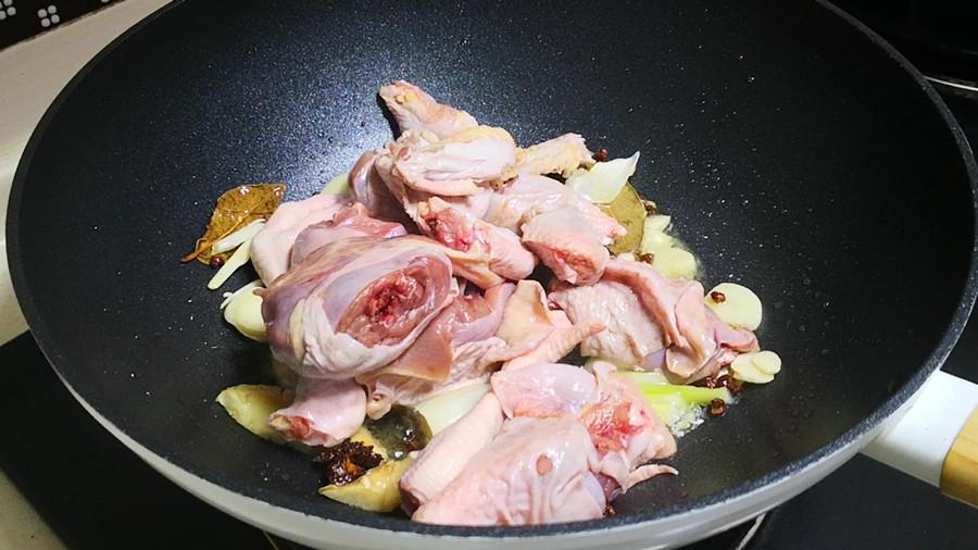 4.接下來,鍋中倒入適量的食用油,油溫5成熱時放入蔥薑蒜、八角和香葉爆香。然後將雞肉塊放入鍋中,翻炒至雞肉表面微微變成黃色,炒出雞肉中的水氣後,再加入適量的生抽、料酒、少許老抽,繼續大火翻炒均勻,讓雞肉充分上色和入味。