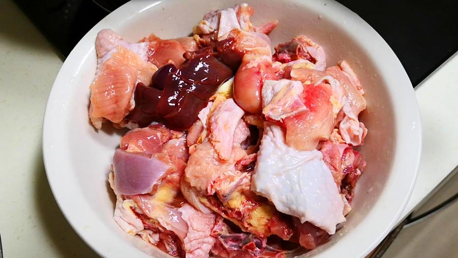 1.準備新鮮的雞肉剁成大小均勻的塊,然後放入盆中,加入清水浸泡片刻,泡出雞肉中的血水,以減輕雞肉的腥味。雞肉一定要新鮮的,如果用冷凍雞肉,需要焯水後再燉。