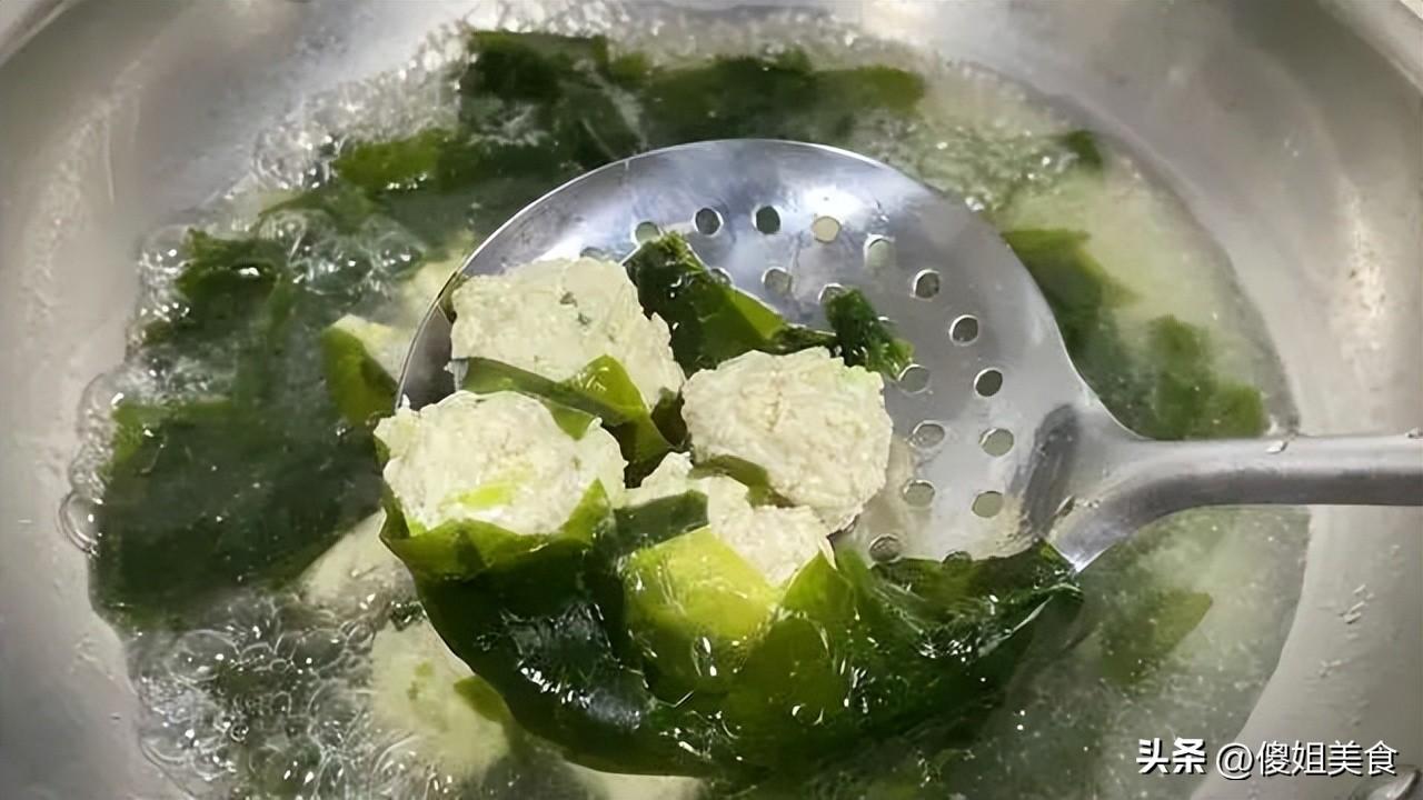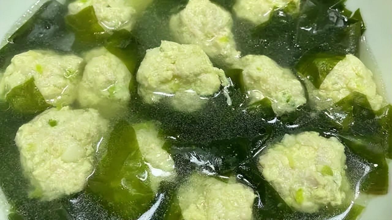 煮湯:鍋中加入適量清水,水開後,將搓好的肉丸子逐個放入鍋中,輕輕攪動,防止粘連。待肉丸子全部浮起後,加入切好的裙帶菜,繼續煮5分鐘。