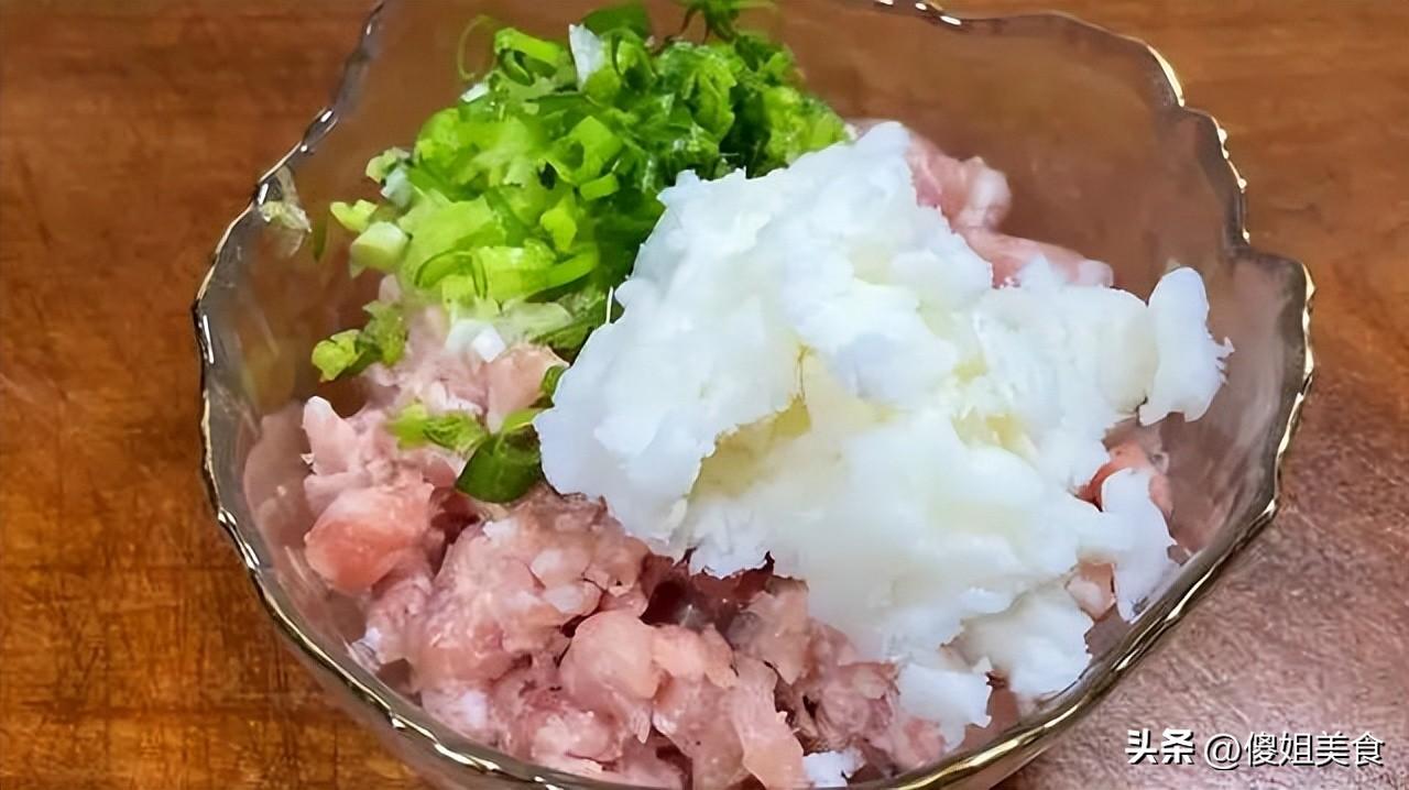 2、製作豬肉丸子:將豬肉剁成肉餡,放入碗中。加入山藥泥,蔥薑末、雞蛋、生抽、料酒、鹽和澱粉,然後用筷子順時針攪拌,直到肉餡上勁。攪拌好的肉餡可以用手搓成一個個小丸子。