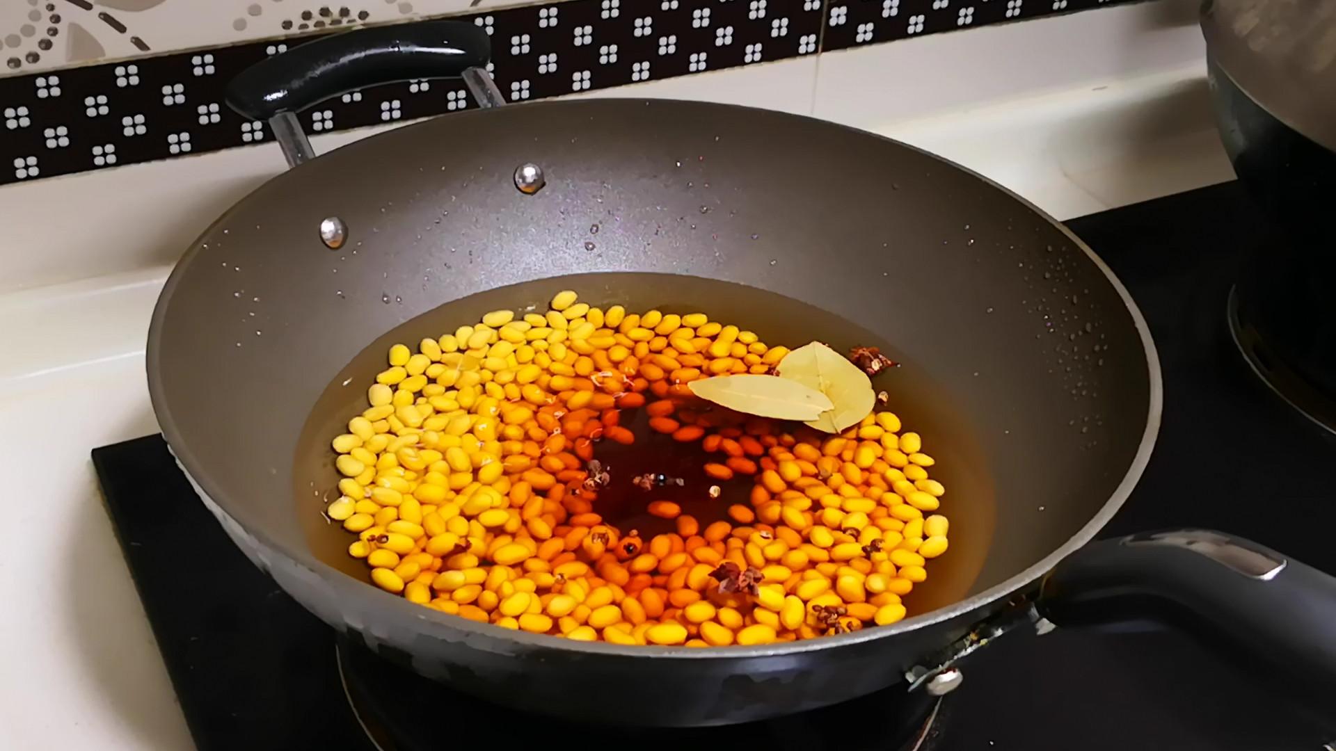 然後清洗乾淨倒入鍋中,加入一勺鹽、一勺白糖、一小把花椒、兩個八角、兩片香葉,再加入適量的生抽和清水,煮20分鐘左右將其煮熟。