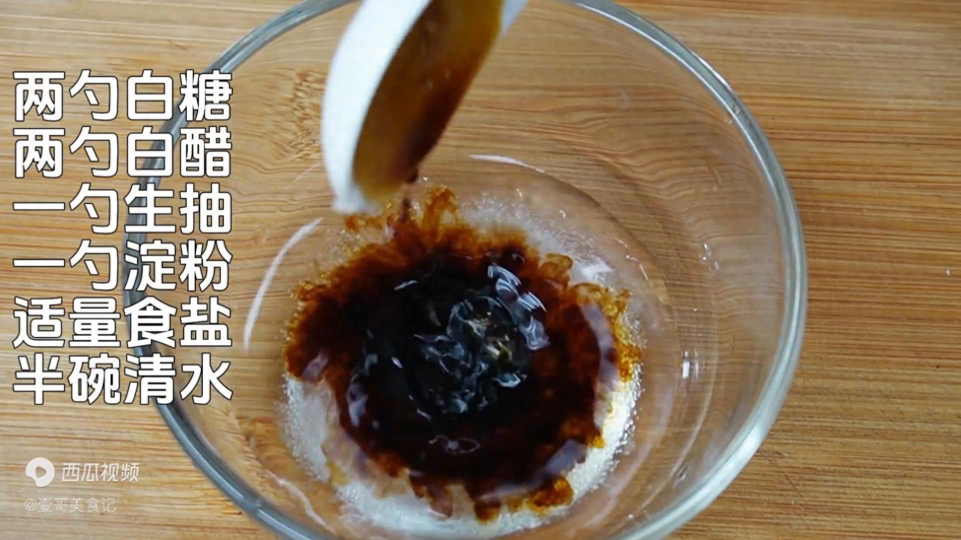 ·一勺食鹽、一勺料酒,打入雞蛋清、一勺澱粉、一勺食用油、兩勺白糖、兩勺白醋、一勺生抽、一勺澱粉、適量食鹽、半碗清水,翻炒三十秒。