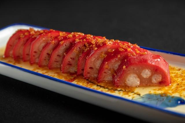 3. 取出煮好的糯米藕,待冷卻後切成薄片,擺盤,淋上鍋中剩餘的湯汁,撒上幹桂花即可。