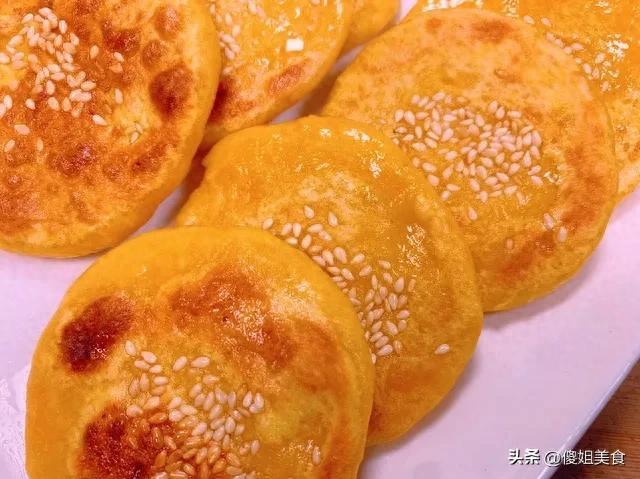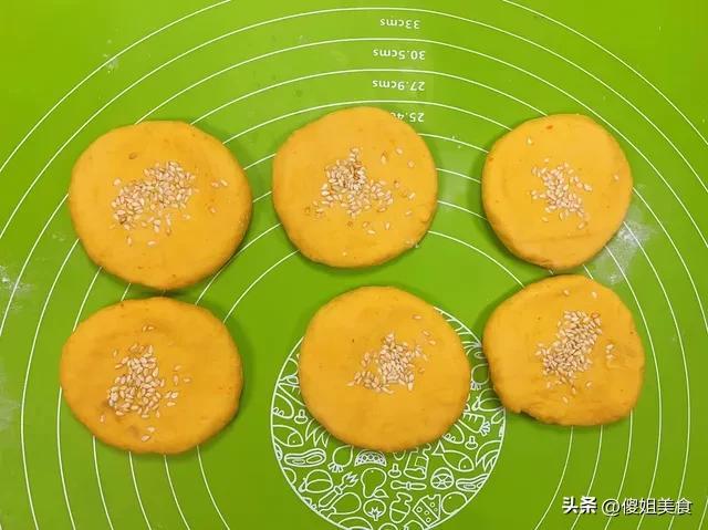 3、取一小塊麪糰,直接用手壓成小餅,在餅的表面撒上一些芝麻,增加營養和提升口感。