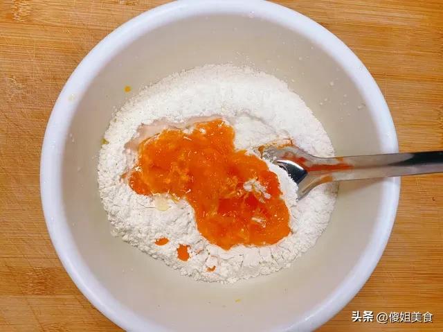 製作步驟:1、將熟透的柿子表皮撕開一個口,果肉和湯汁就流入碗中了,如果有比較大塊的果肉,可以先用勺子壓碎。在柿子泥中少量多次地加入麪粉,攪拌均勻,下手揉成麪糰。爲了小餅的口感好,不要加水哦。