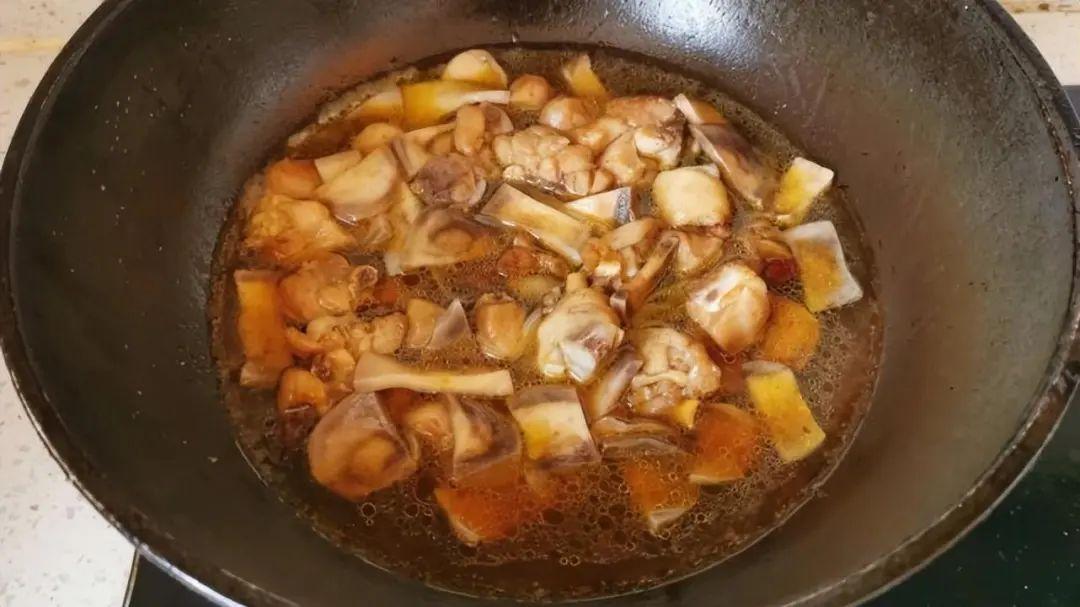 燉煮:加入泡發好的土豆乾,翻炒均勻。然後加入生抽、老抽、冰糖,繼續翻炒,讓雞腿和土豆乾均勻上色。加水燉煮:倒入足夠的清水,水量要能覆蓋住雞腿和土豆乾。加蓋,用中小火燉煮40-50分鐘,直到雞肉熟爛、土豆乾變得軟嫩。中途可以適量加入一些鹽,根據個人口味調整。