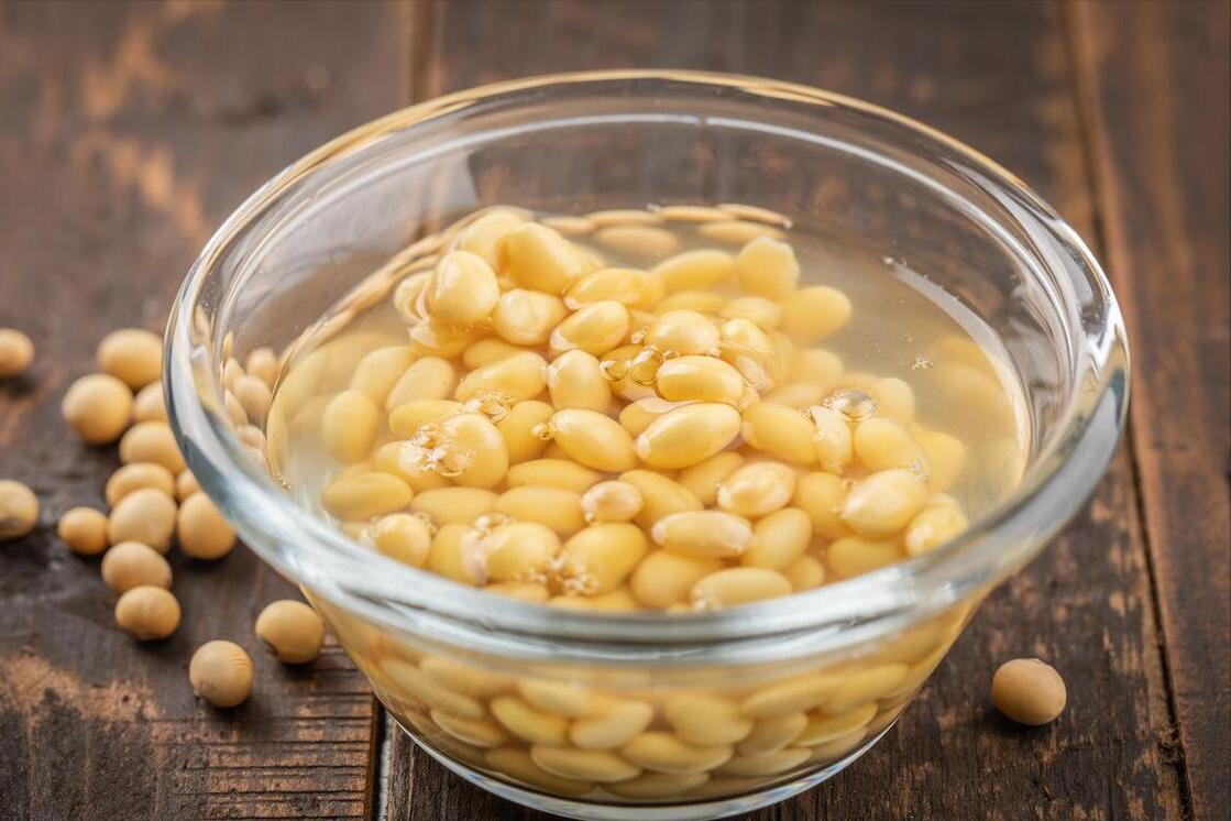 1、準備一把黃豆,把黃豆倒在水中浸泡1個晚上,等到第二天之後,黃豆泡得差不多了,之後我們將其稍微沖洗一下,然後倒在破壁機內。