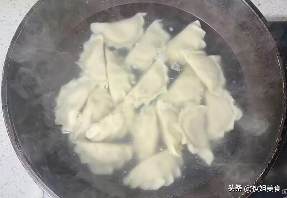 4、鍋裏燒開一大鍋水,把餃子放入沸水中,用勺子輕輕推動,防止餃子粘鍋。水再次沸騰後,加入一碗冷水,重複三次。等餃子全部浮起來,皮變得晶瑩剔透,就說明熟了。