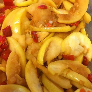 2、處理好的柚子去頭去尾,目的是容易剝皮,然後很關鍵,用刀從中間化開,小心不要切到果肉,沿着裂縫扒去外皮,再把柚子皮中間的瓤颳去,然後把柚子皮切成均勻大小的條,放入淡鹽水中浸泡1~2個小時,目的是爲了去除它的苦澀味。