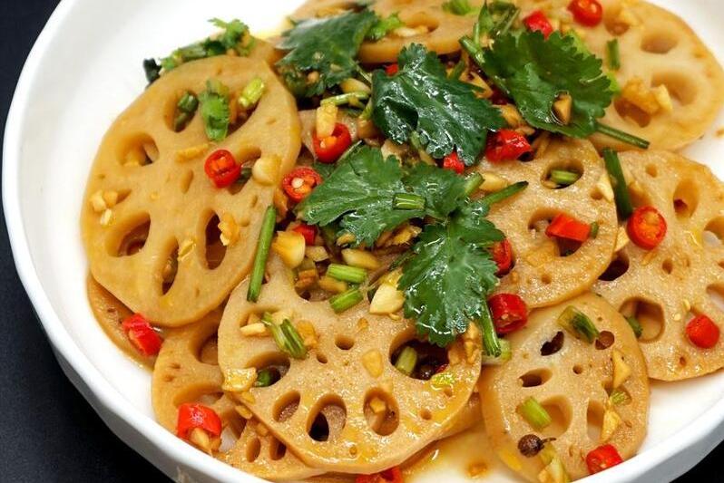 用到:蓮藕、小米椒、香菜、蔥花、大蒜、鹽、味精、香油、生抽、醋