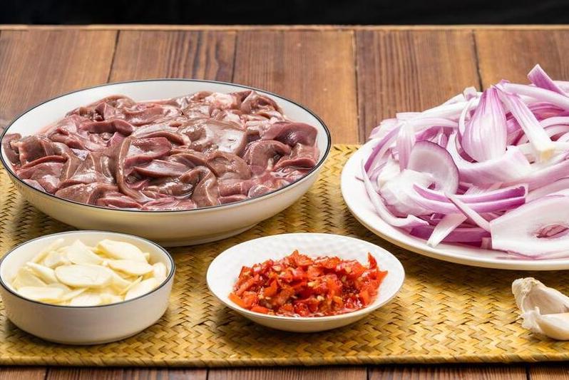 準備:豬肝、洋蔥、青紅辣椒、蔥薑蒜、鹽、白胡椒粉、味精、白糖、生抽、老抽、料酒、食用油
