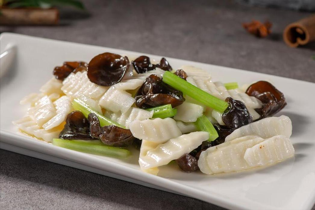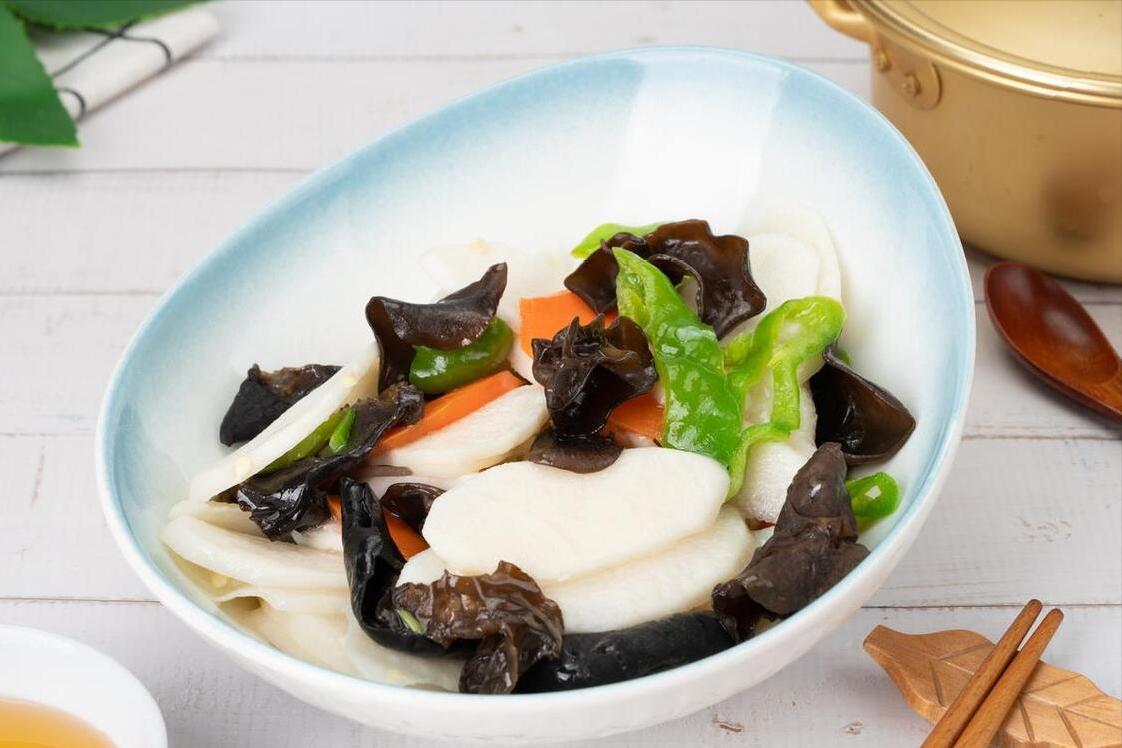 準備:山藥、木耳、青椒、胡蘿蔔、鹽、雞精、蔥蒜