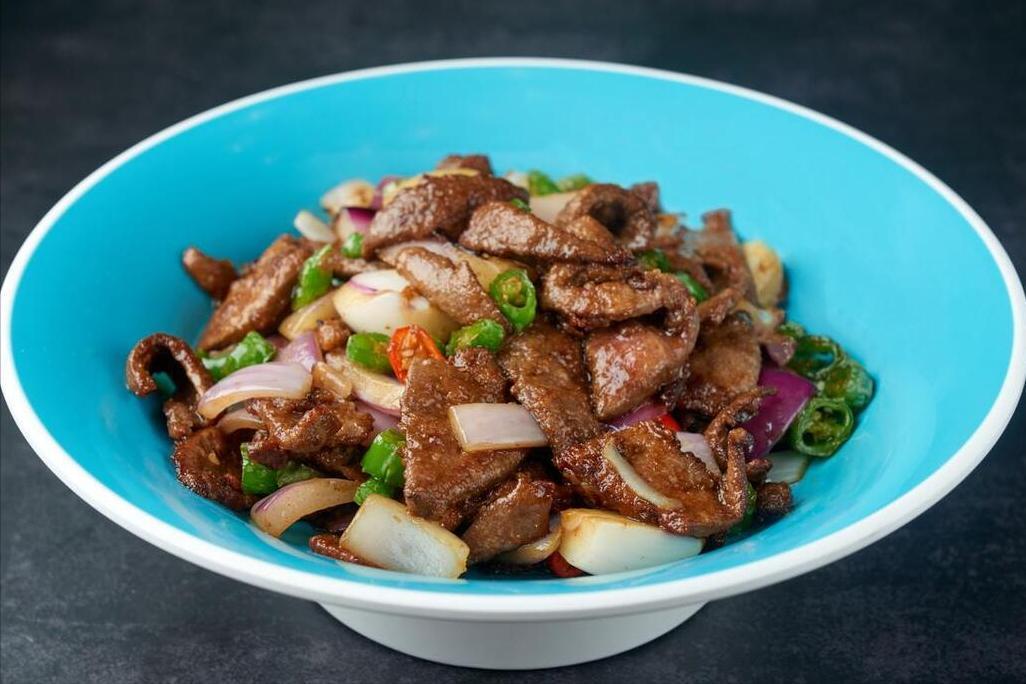 2、鍋子裏倒油,下入豬肝大火快速翻炒,炒到斷生後盛出來。緊接着把洋蔥、青紅椒、蔥薑蒜一起倒進去,炒出香味後,再把豬肝倒進去,順便用鹽、味精、生抽、老抽調味,快速炒勻後,出鍋開喫。