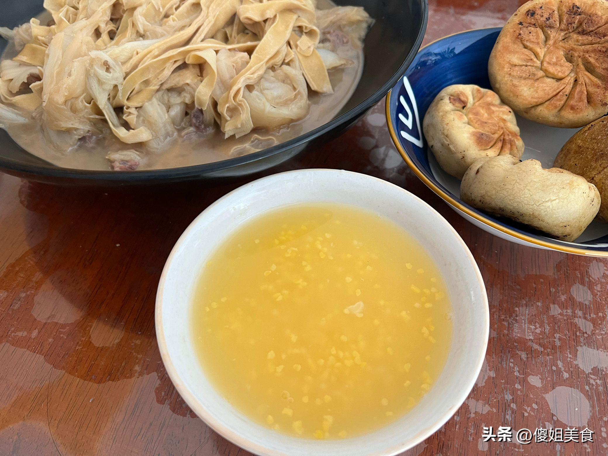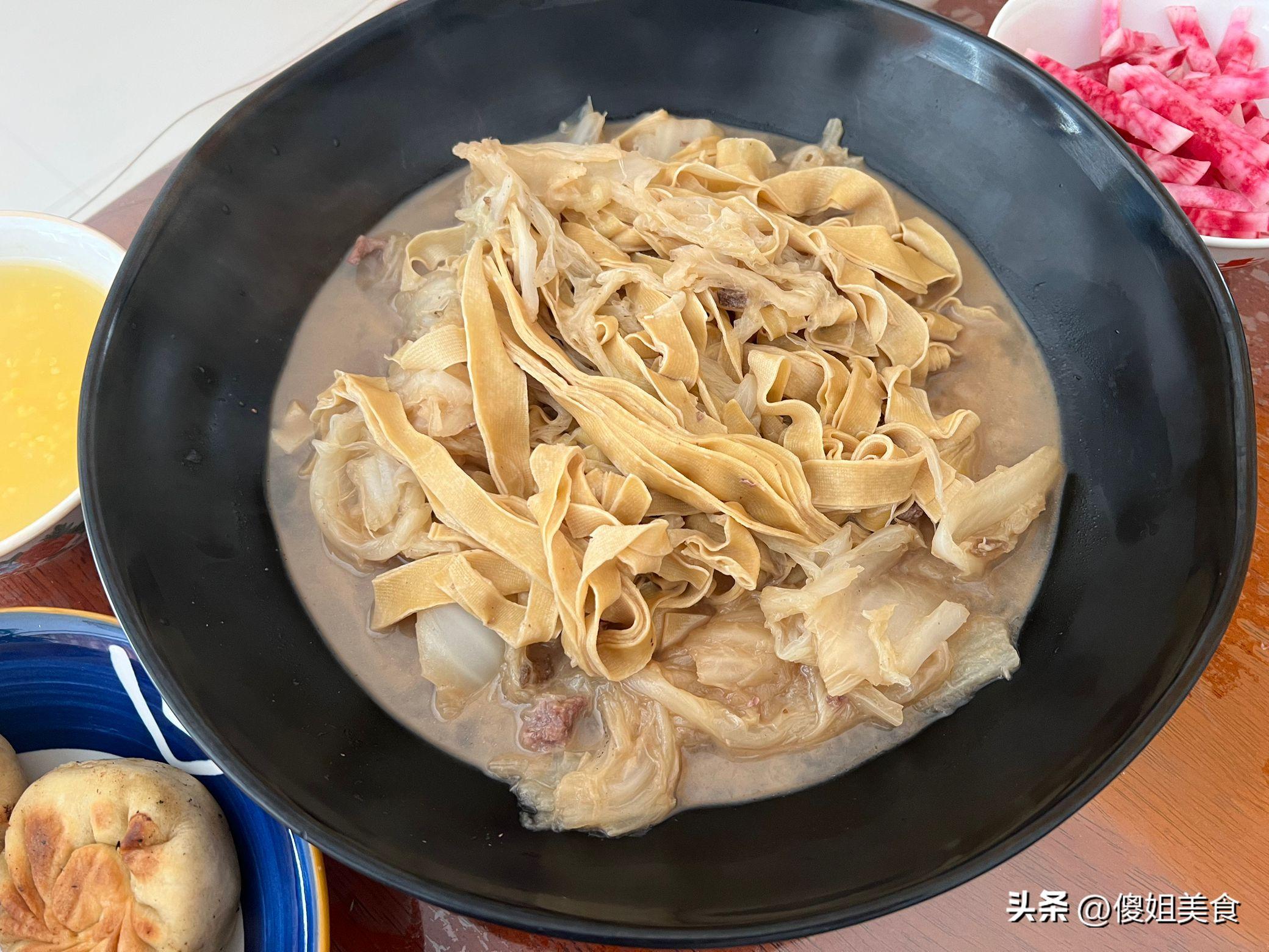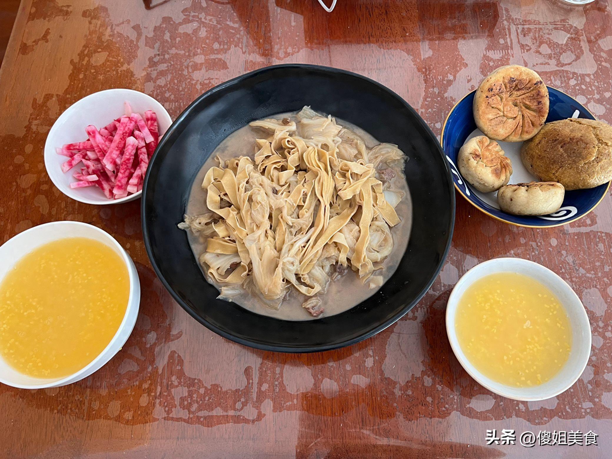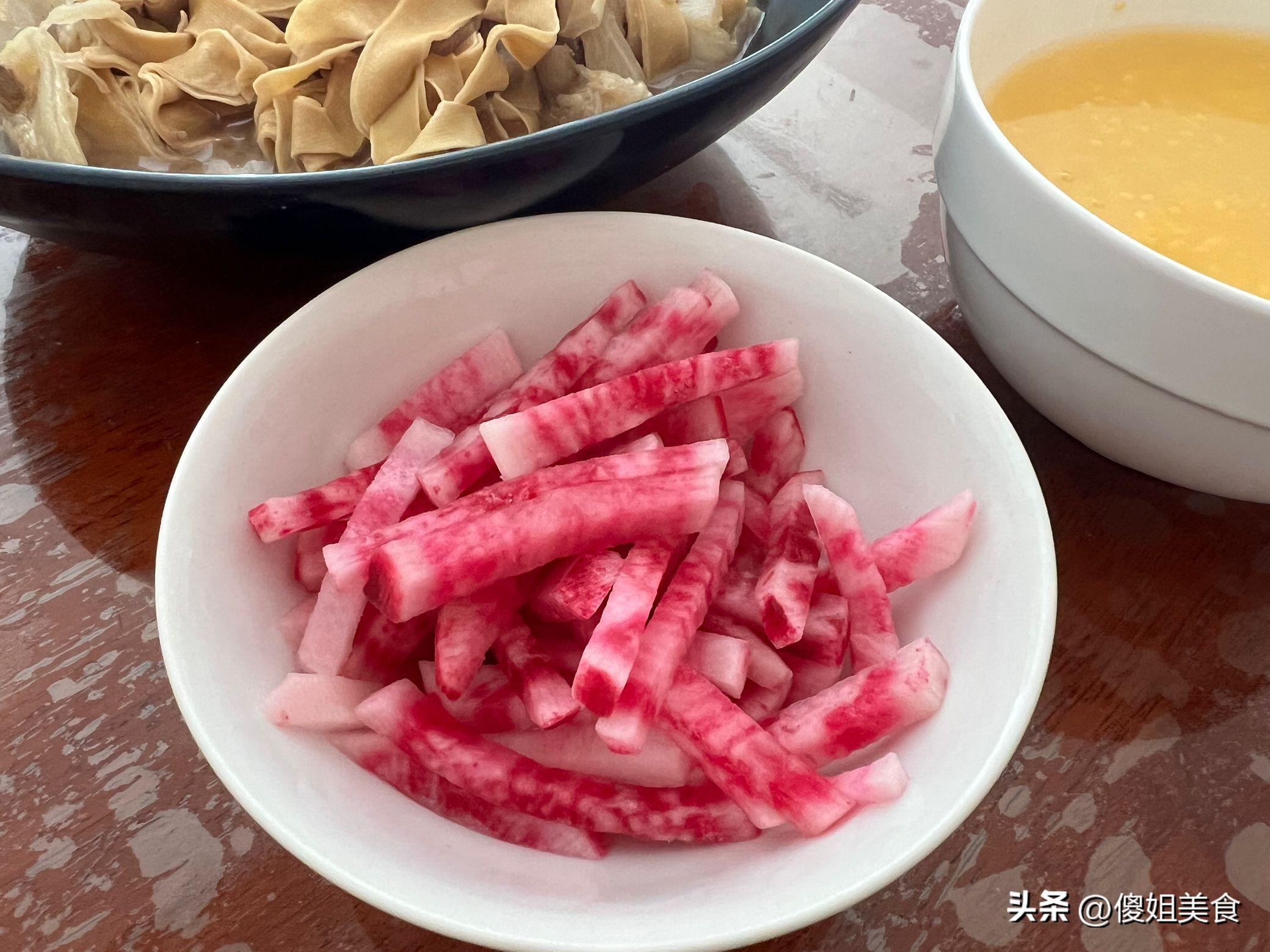 我給大家說道說道我這頓早餐哈。先說這燉白菜豆腐皮,把白菜切成塊,豆腐皮切成條。鍋裏放點油,蔥薑蒜爆香,先把白菜炒軟,再放豆腐皮,加上水,加點鹽、生抽,燉上一會兒就出鍋。最後是紫蘿蔔小鹹菜,把紫蘿蔔切成絲,用鹽醃一會兒,擠掉水分,加上點醋、糖、辣椒拌一拌,清爽可口。