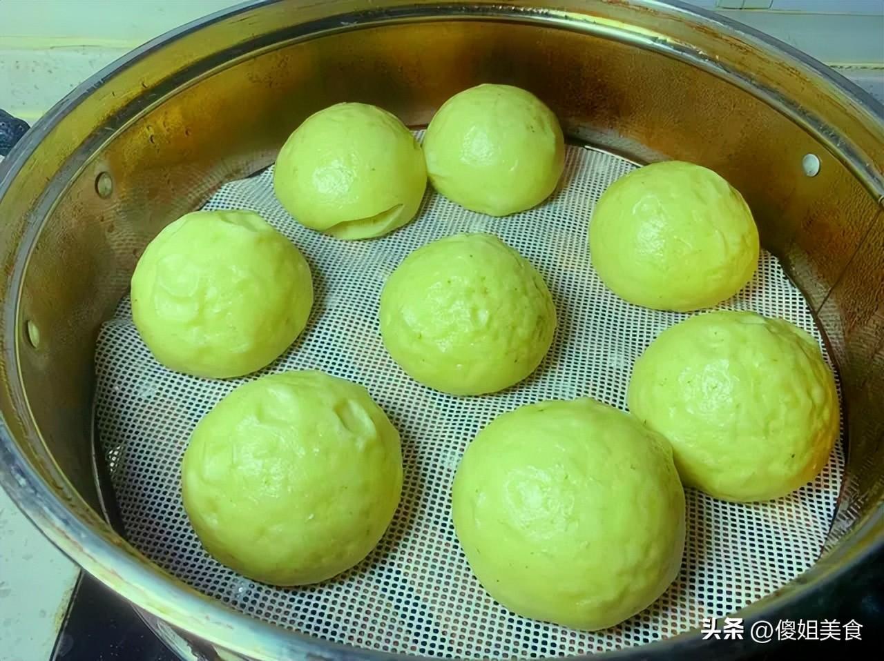 4、發酵好的麪糰取出,揉搓排氣,然後分成小劑子,揉成饅頭。將揉好的饅頭擺放在蒸屜上,間隔留一定距離,再次發酵10分鐘,這時會看見饅頭明顯變大。醒發好以後開火蒸,大火蒸15分鐘,關火後燜2分鐘再揭蓋,這樣饅頭不容易回縮。