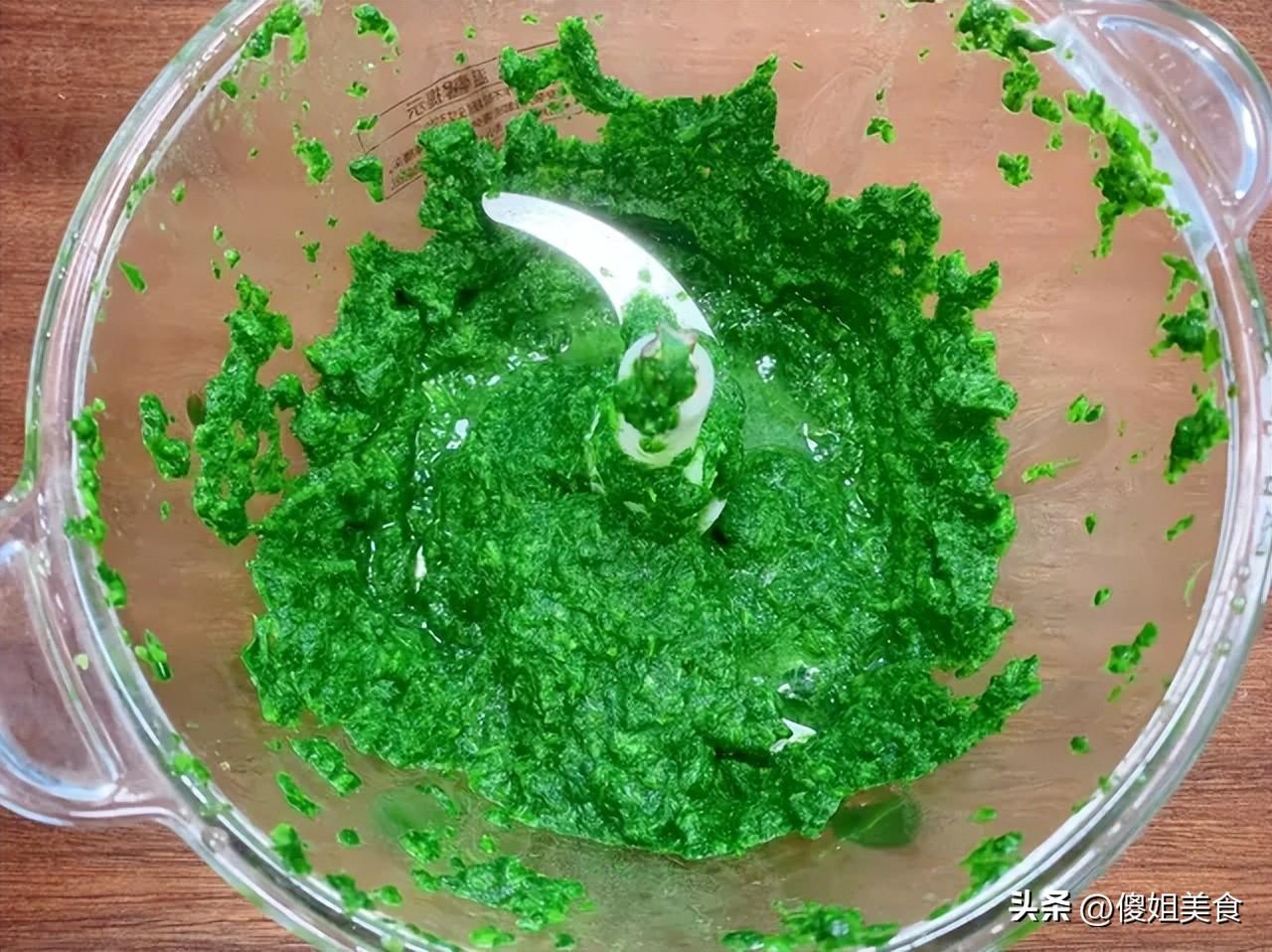 2、把焯水後的菠菜切成小段,放入攪拌機中,加入適量的清水,打成細膩的菠菜汁。將麪粉倒入盆中,加入酵母粉,用菠菜汁代替水,慢慢倒入麪粉中,同時攪拌,直到揉成一個光滑的麪糰。