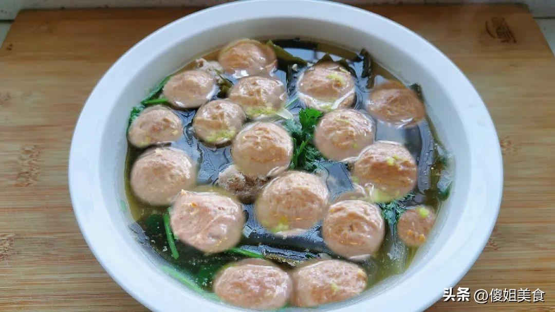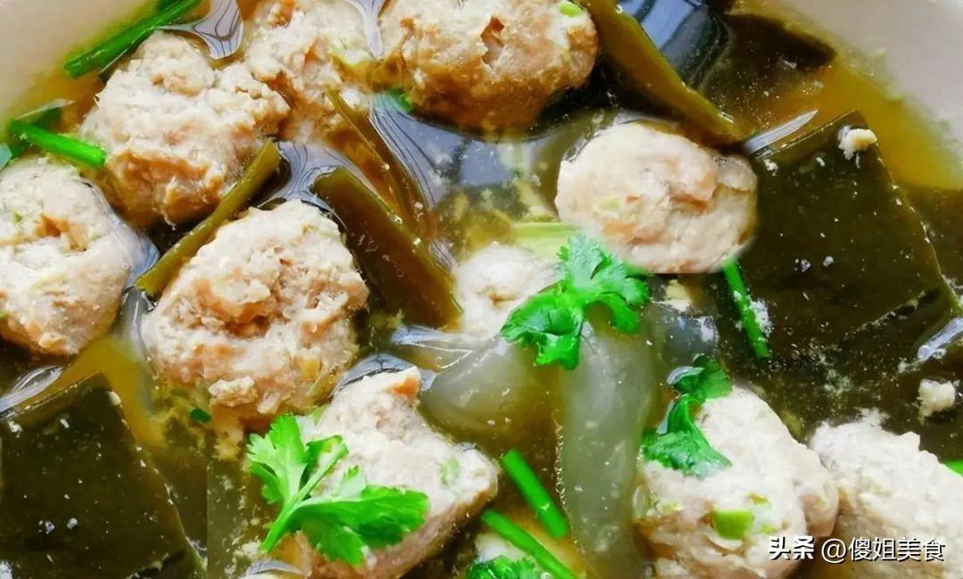 3、在鍋中燒開適量清水,將攪拌好的肉餡擠成小丸子,可以用手擠也可以用勺子輔助。將丸子輕輕放入開水中,爲了增加鮮美的口感,我還加了點海帶,丸子浮起後改小火煮5分鐘,最後淋入陳醋,撒上香菜,關火盛出。