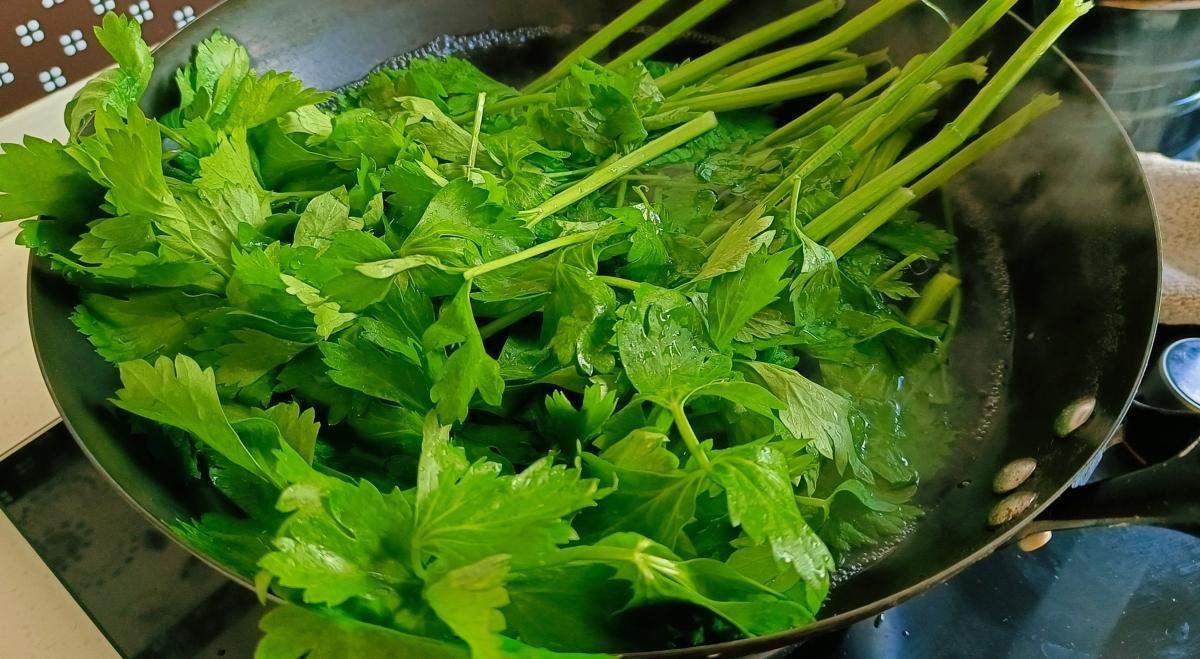 起鍋燒水,水開後放入洗淨的芹菜焯燙一下,大約焯燙1分鐘後撈出芹菜過涼水,瀝乾水分後切成芹菜段備用。