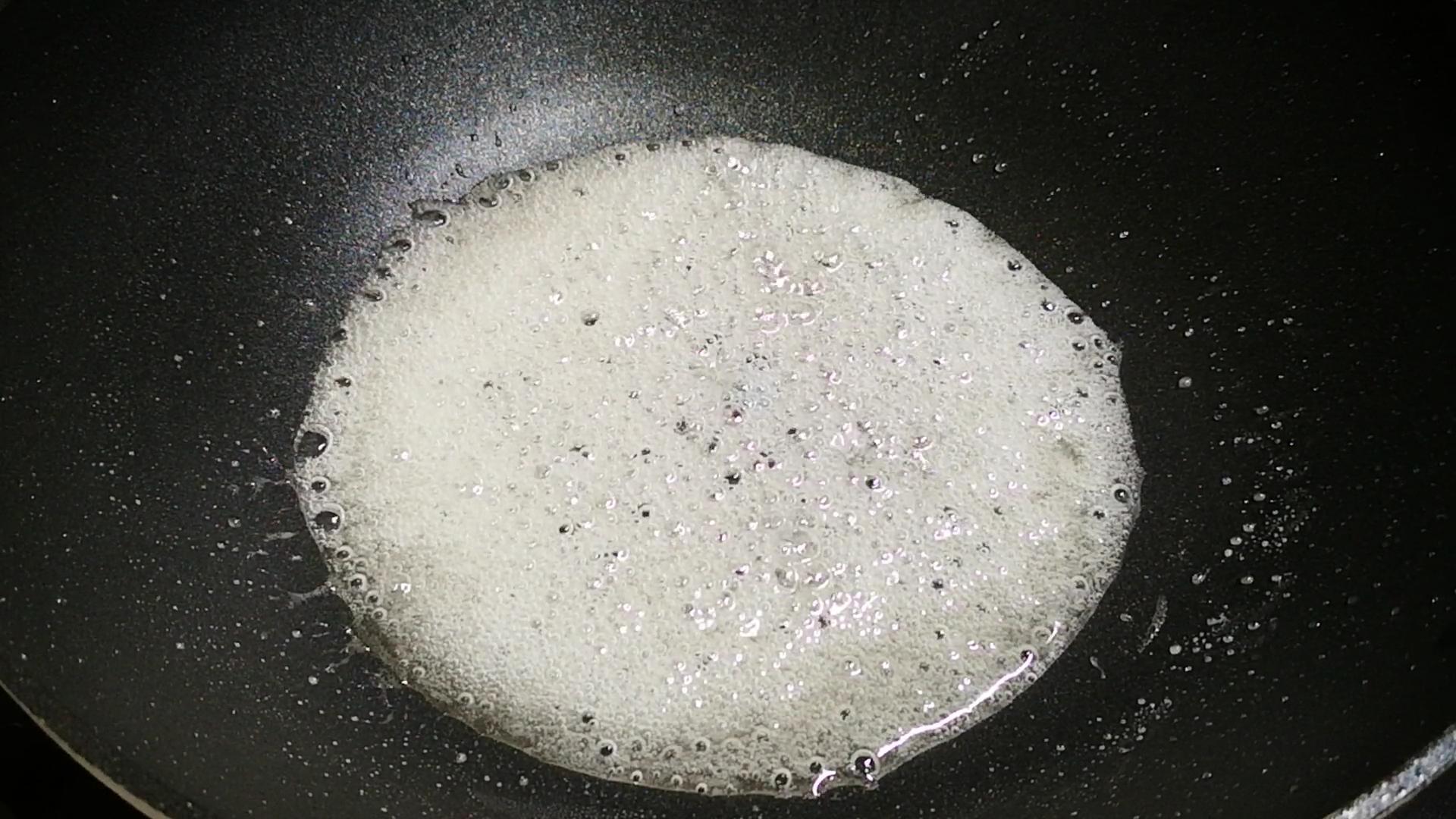 2、熬糖漿,這也是這道美食的關鍵所在,起鍋加水和白糖,水與糖的比例是1:1,先開大火熬製,邊攪拌邊熬製,直到出密集的大泡,再轉小火繼續熬製,熬到出密集的小泡,推動有阻力即可。