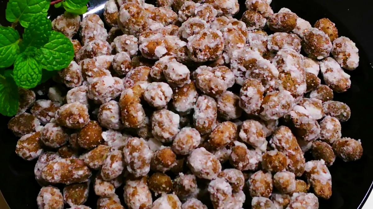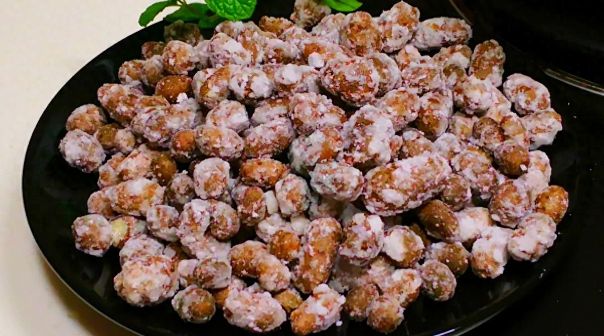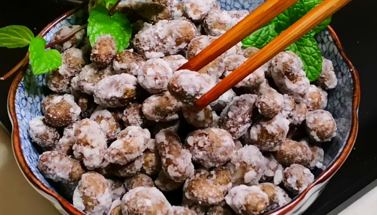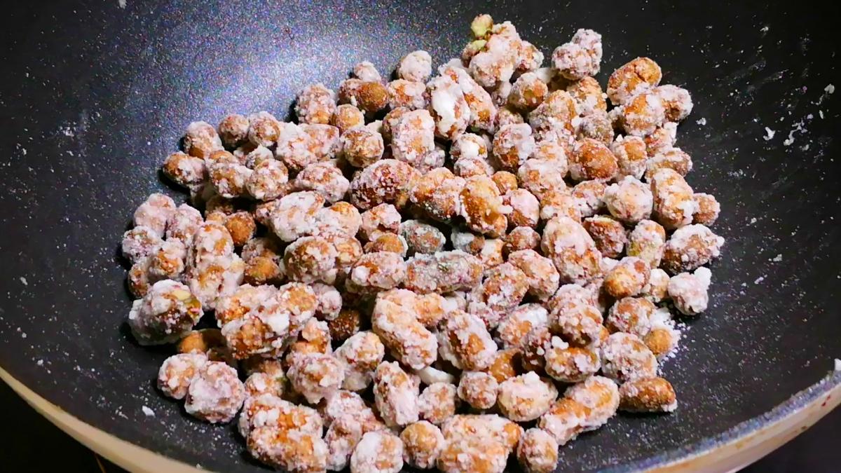 3、掛漿,糖漿熬好後要立即倒入山藥豆,而且要不停地翻動,一開始會黏在一起,不要緊張,繼續翻動,一會兒就會個個裹滿糖漿,直到翻炒至每個山藥豆都分離開,且泛出白沙時就可以關火出鍋了,這樣掛霜山藥豆就做好了。