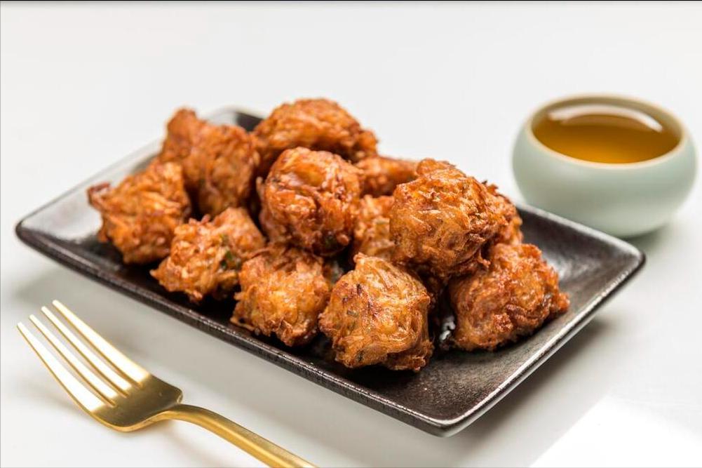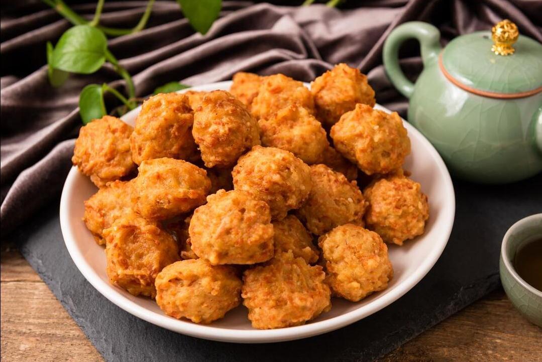 2、攪拌均勻之後,接下來我們再往其中加上適量的麪粉和澱粉來調製麪糊,調製成稀稠適中的麪糊之後,準備來炸。鍋子裏多來點油,燒熱以後將其團成一個個的蘿蔔丸子,下入鍋中炸到金黃,出鍋開喫。