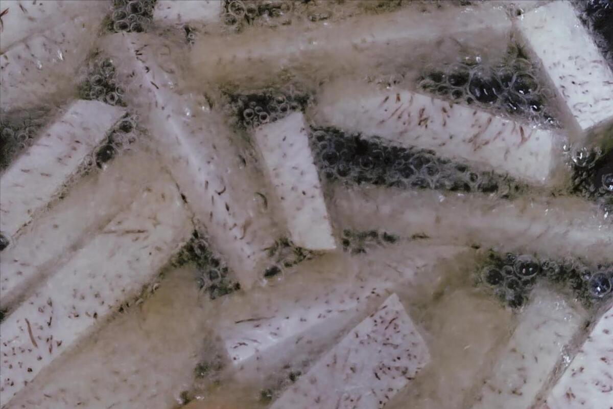 2、洗淨以後將外皮削掉,然後再把芋頭切成條狀,接下來往鍋內多來點油,等燒熱到180度左右,我們將芋頭下進去開始炸,炸的時候用漏勺不停的攪動,防止粘連,炸到漂起來就是可以了。