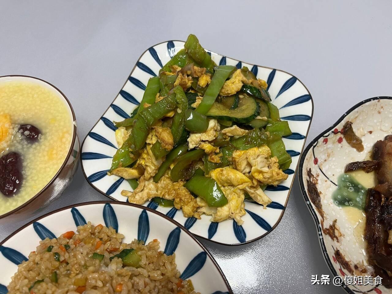 炒雞蛋的時候多炒了幾個,想着早上喫飯也沒個鹹菜,總不能喫鹹菜條吧,正好冰箱裏還有幾個青椒,辣乎乎的孩子們也愛喫,就簡單的炒了個青椒炒雞蛋,也不費事,兩三分鐘就炒熟。懂事的兒媳婦還說,阿姨辛苦了,早上還做的這麼豐盛。