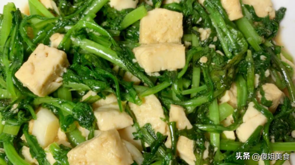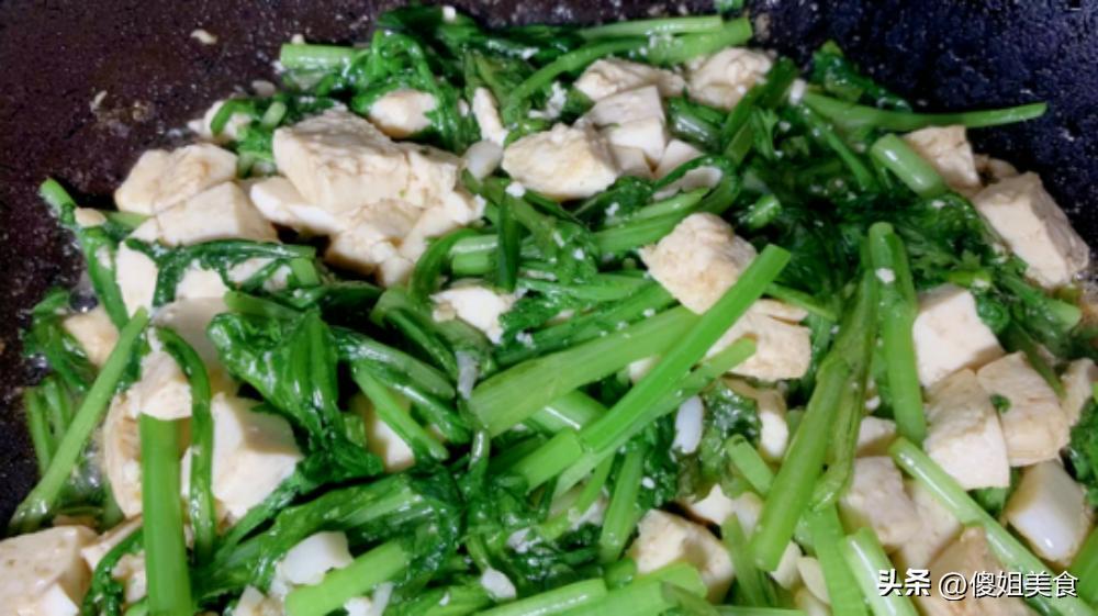 分享食譜【茼蒿炒豆腐】準備食材:茼蒿,豆腐,蔥,蒜,胡椒麪,食鹽,白糖