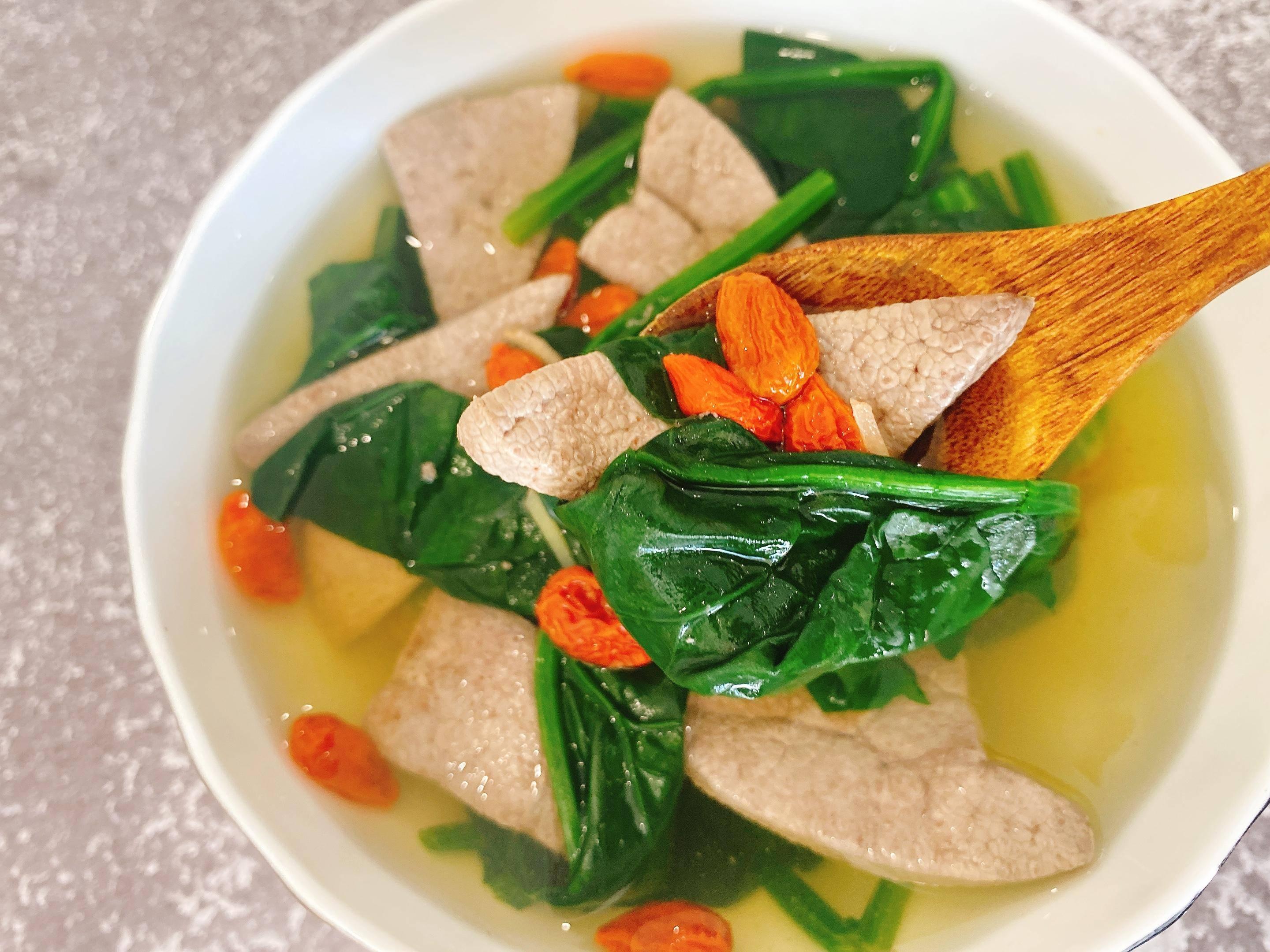 食材:菠菜1把,豬肝1小塊,枸杞, 鹽,胡椒粉,蔥