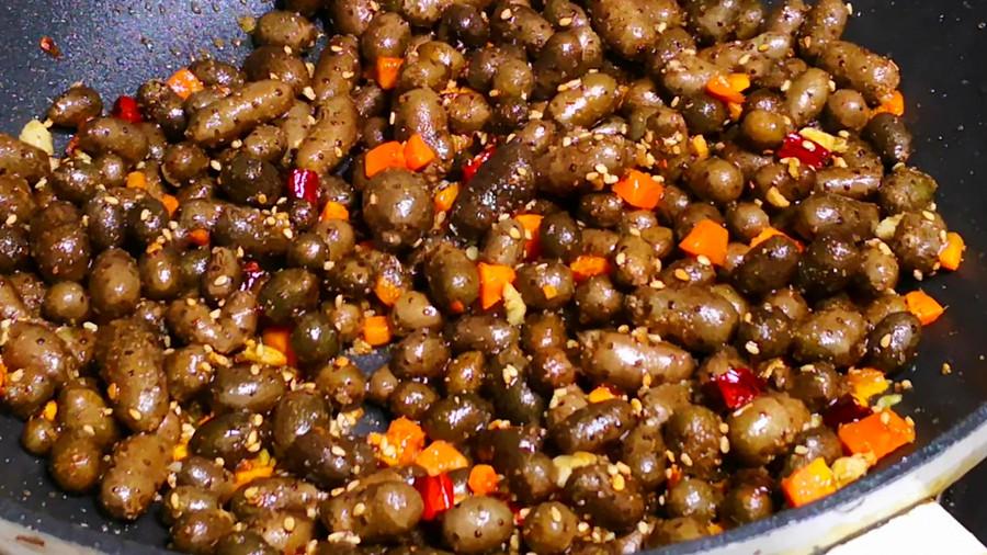 3、起鍋加油,油溫五成熱下入幹辣椒段和蒜末,炒出香味後倒入胡蘿蔔丁,翻炒至胡蘿蔔丁變軟後倒入山藥豆,大火翻炒片刻後開始調味:撒上一把白芝麻,然後加入適量的鹽、白糖、孜然粉和胡椒麪,翻炒至山藥豆表面均勻裹上調味料後,即可關火出鍋裝盤。