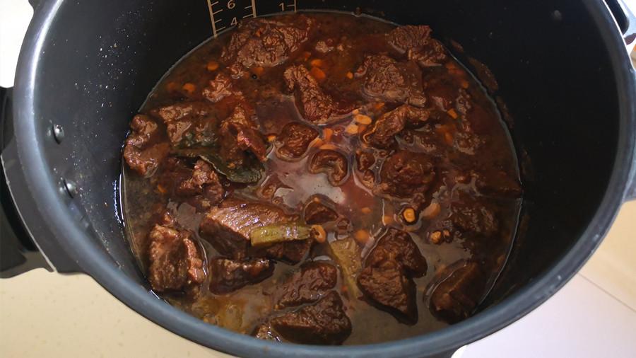 起鍋加入適量的油,油熱後先下入蔥薑蒜,炒出香味後再下入牛肉塊翻炒,炒出牛肉中的水氣,炒至牛肉表面微微發黃時,加入適量的生抽、料酒、1勺黃豆醬、冰糖,翻炒至少牛肉上色後,再加入適量的熱水,將其轉移到電壓力鍋中。然後加入花椒、大料、白芷、香味和桂皮,蓋好蓋子,選擇燉肉鍵燉煮30分鐘。