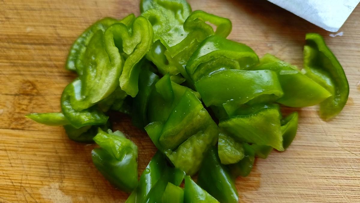 2.土豆兩個去皮洗淨後切成小塊備用;胡蘿蔔適量切成小塊備用;一個青椒洗淨去籽後切成小塊備用。