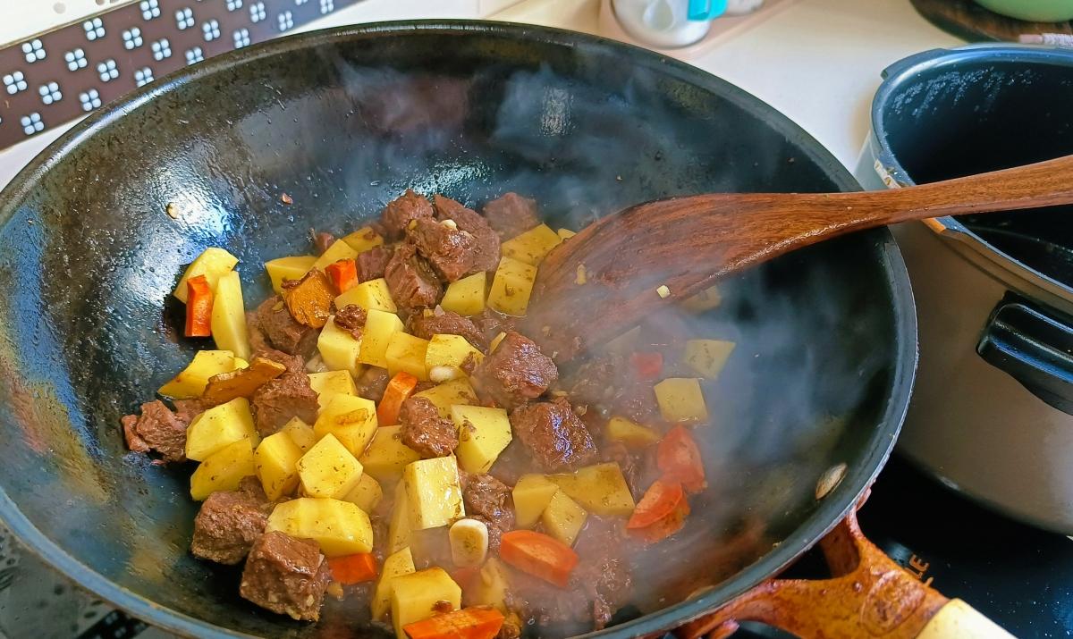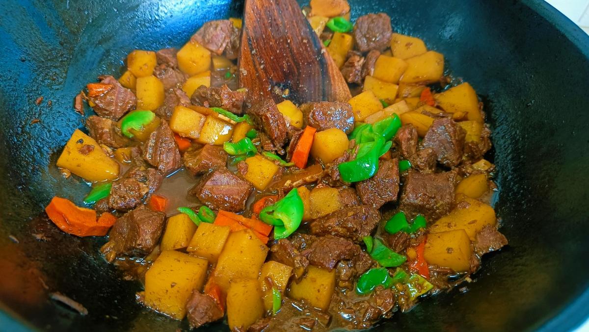 炒鍋熱鍋加油,下入煮好的牛肉塊,翻炒一分鐘後再加入土豆和胡蘿蔔塊,翻炒均勻後再加入適量的生抽、少許老抽和食鹽,繼續炒勻後倒入燉牛肉的湯汁,蓋好鍋蓋慢慢燉煮,讓牛肉和土豆的味道相互融合,充分吸收料汁入味。