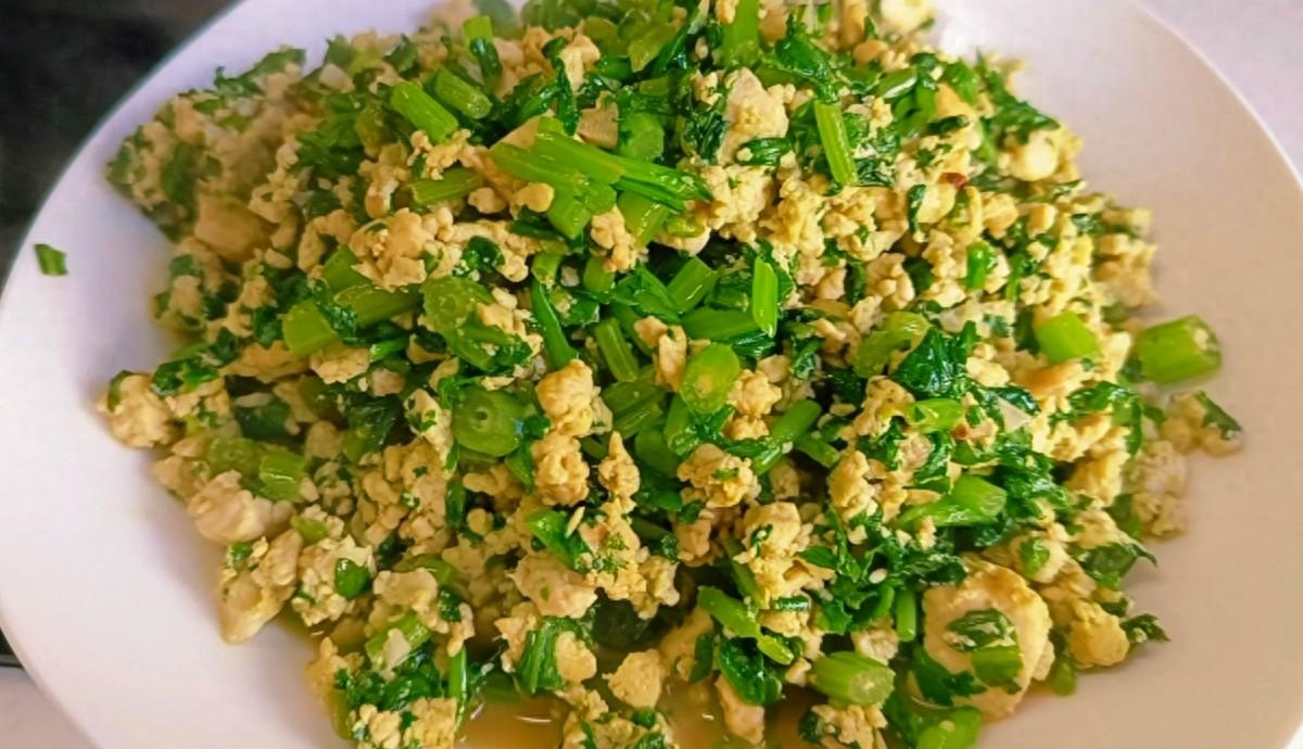 3.起鍋加油,油熱後先下入蔥花、蒜末和薑末翻炒,爆出香味後再倒入攪拌均勻的茼蒿豆腐渣,繼續用中小火慢慢翻炒,讓其均勻受熱,並讓茼蒿和豆腐渣充分融合,炒至豆腐渣顏色微微變黃時,茼蒿也就炒熟了,這時即可關火,出鍋前根據個人口味加一點雞精或味精,再次炒勻後即可關火出鍋,美味即成,一道營養又美味的茼蒿炒豆腐渣就做好了,又香又下飯!