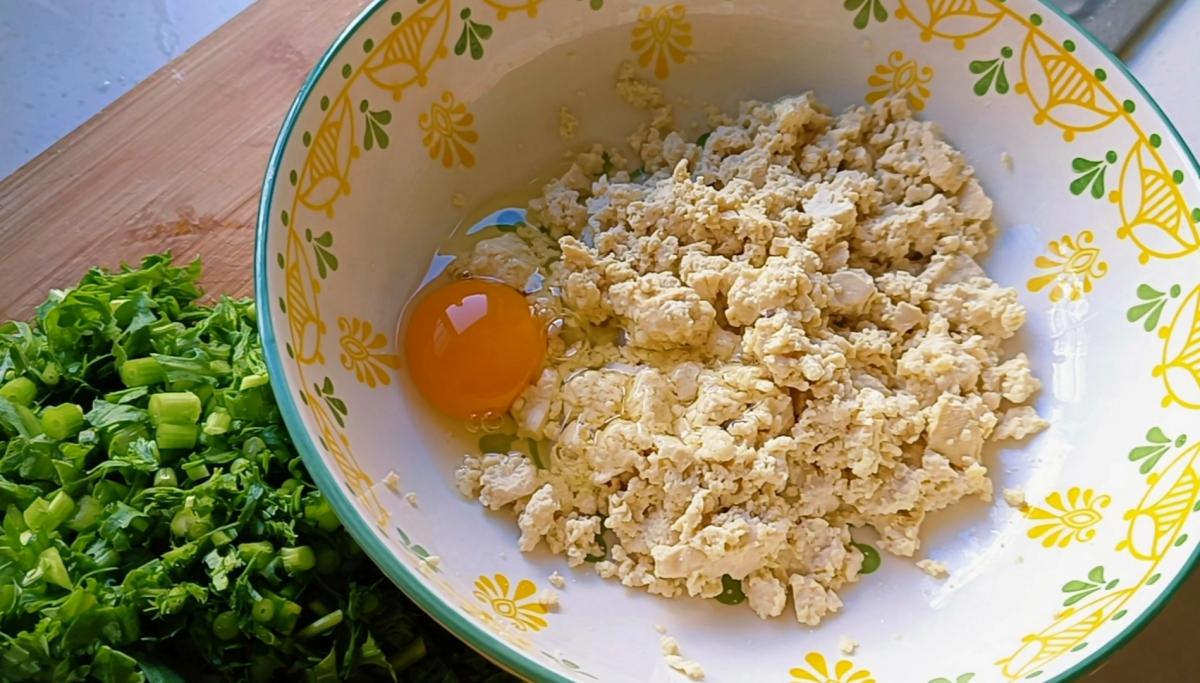 接着將豆腐渣和茼蒿放到一起,磕入一個雞蛋,加入適量的食鹽、生抽、蠔油,再次下手將其攪拌均勻。