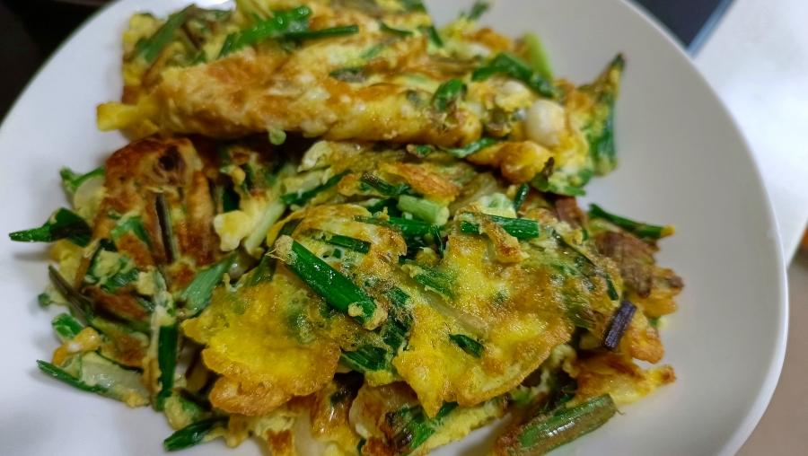 2.熱鍋涼油,燒至油溫熱時倒入攪拌均勻的小根蒜和雞蛋液,待雞蛋液定型後翻面,煎至兩面都呈金黃色時關火,盛出裝盤,美味的小根蒜炒雞蛋就做好了,香~