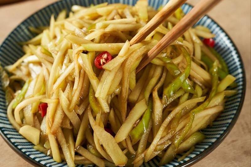 4、倒進去以後稍微翻炒兩下,然後來進行調味,加上適量的鹽、味精還有一點生抽,炒勻以後再往裏面加上適量的清水,稍微燜煮一會兒,直至鍋內的湯汁收到差不多以後,撒上小米椒,即可出鍋。