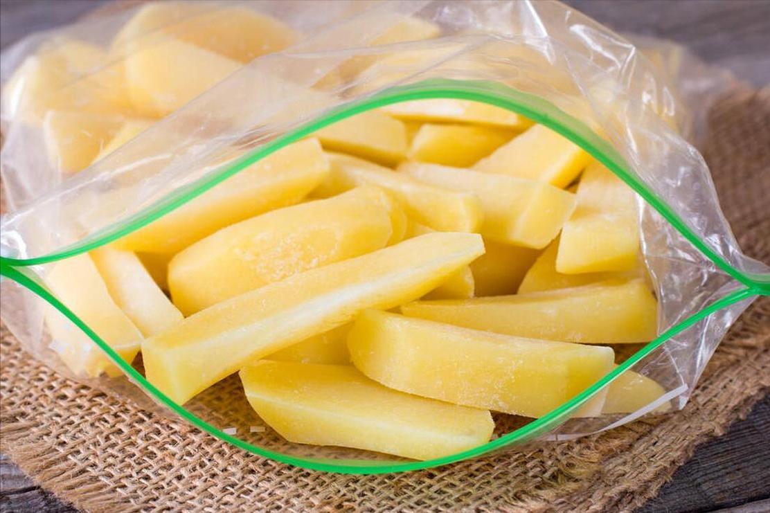 4、這樣炸出來不夠酥脆,涼了很容易回軟,因此這裏還需要多做1步。我們準備一個保鮮袋,把土豆條裝進去以後,放入冰箱內冷凍2個小時,經過冷凍後的薯條,炸出來更成型,而且更酥脆,這就是“多做1步”。