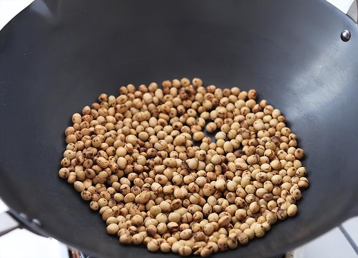 2鍋裏燒熱,放進黃豆,中小火把水分炒幹,不停的翻拌,防止炒糊
