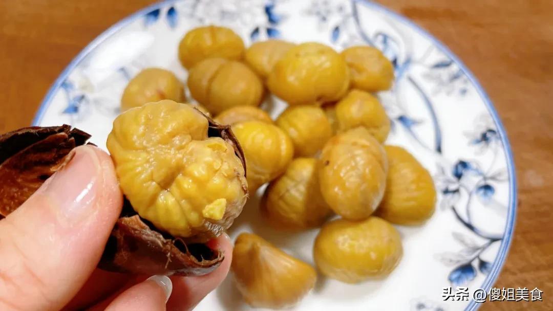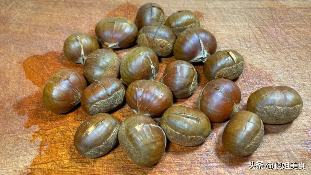 2、板栗剝殼,如果覺得剝殼麻煩,可以先將板栗表面劃十字刀口,放入熱水中煮2-3分鐘後再剝皮,輕鬆又快捷。