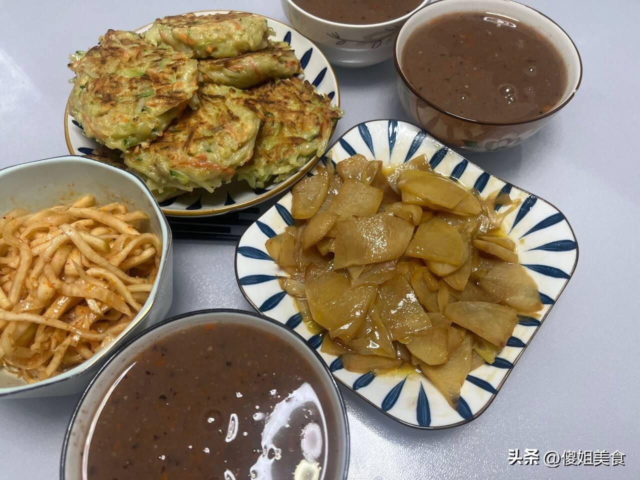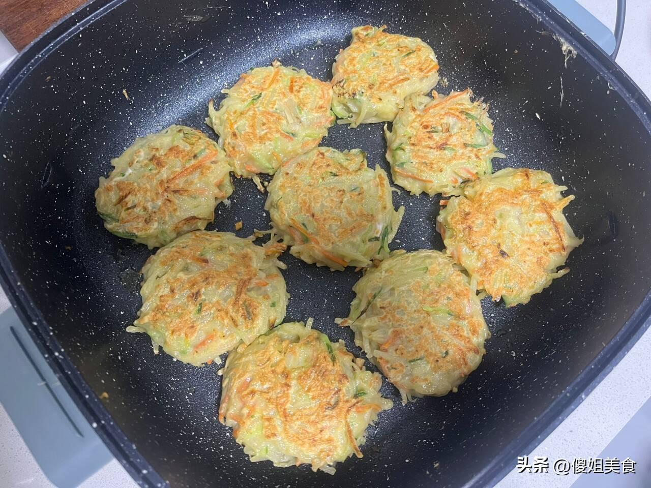 我家一年到頭幾乎都不買蔬菜,自家有個小菜園被婆婆打理的很好,雖然地不大,但是種的蔬菜種類可多了。晚上婆婆就拿胡蘿蔔、土豆、黃瓜做了個蔬菜雞蛋餅,喧軟好喫。首先把土豆、黃瓜、胡蘿蔔洗乾淨後切成細絲,土豆絲要記得多衝洗幾遍把裏面的澱粉洗乾淨,然後往加入少許乾麪粉、3個小笨蛋,放少許鹽攪成麪糊狀,放在不粘鍋裏煎一下,煎兩面金黃就可以。這樣做蔬菜餅金黃酥脆還好喫,比炒蔬菜好喫多了。