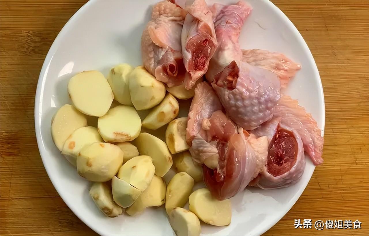 【茨菇燉雞】 所準備的食材有:茨菇、雞肉、大蔥、生薑、鹽、食用油、冰糖、醬油