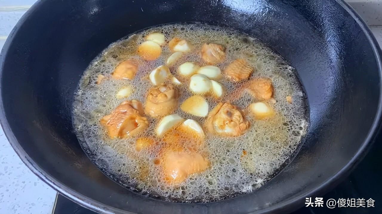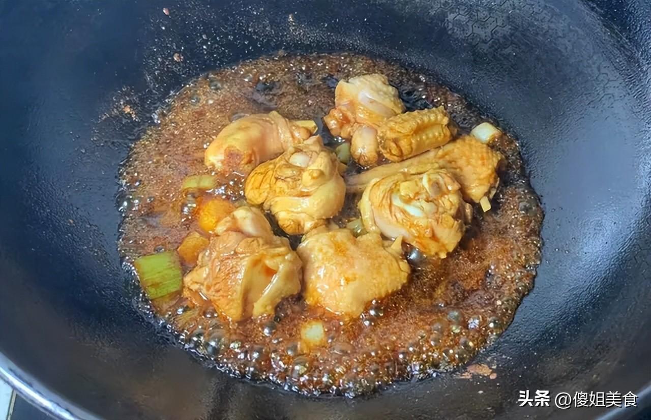 3、雞肉炒至上色後,倒入足量的熱水,水量以能沒過雞肉爲宜,大火燒開後,轉中小火燉煮20分鐘。