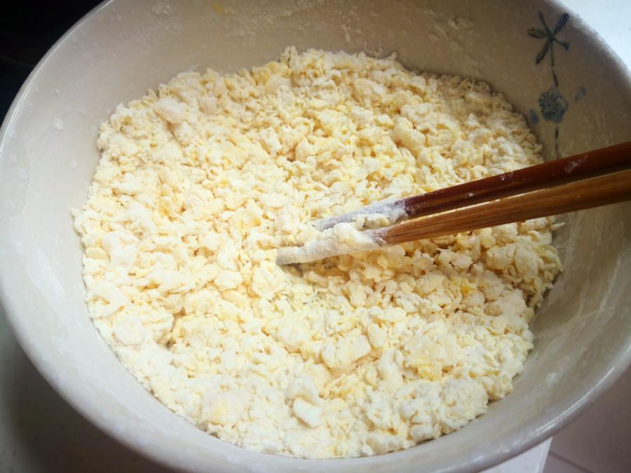 2、趁燒水的時間我們準備一下面疙瘩,盆內加入適量麪粉、少許鹽,然後分少量多次倒入打散的雞蛋液,一邊倒一邊用筷子順時針攪拌,攪拌的速度要快,直至攪拌到沒有乾麪粉了即可。