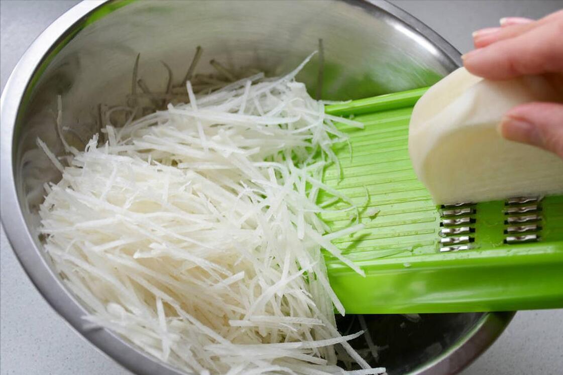 1、準備一根白蘿蔔,把白蘿蔔放在水中清洗乾淨以後,擦成細絲,也可以稍微剁一下,剁碎也行,倒在一個小盆裏。