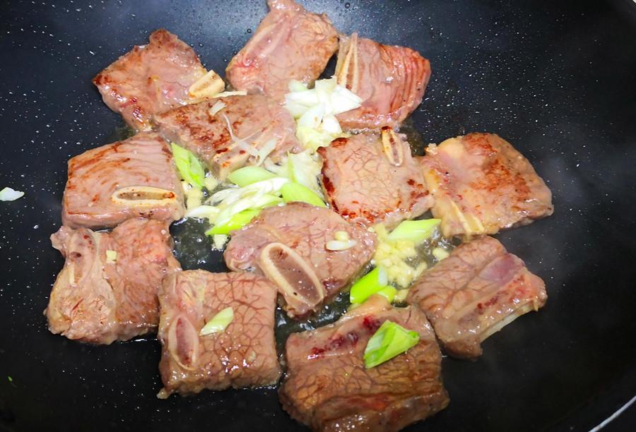 3.熱鍋加油,下入醃製入味的牛仔骨煎炒,煎至牛仔骨表面微微變焦時下入蔥花、薑末和蒜末,繼續翻炒片刻,炒出香味,這時已經可以聞到牛仔骨散發出的濃郁香味了,忍不住想喫上一口,不過,別急,還要繼續: