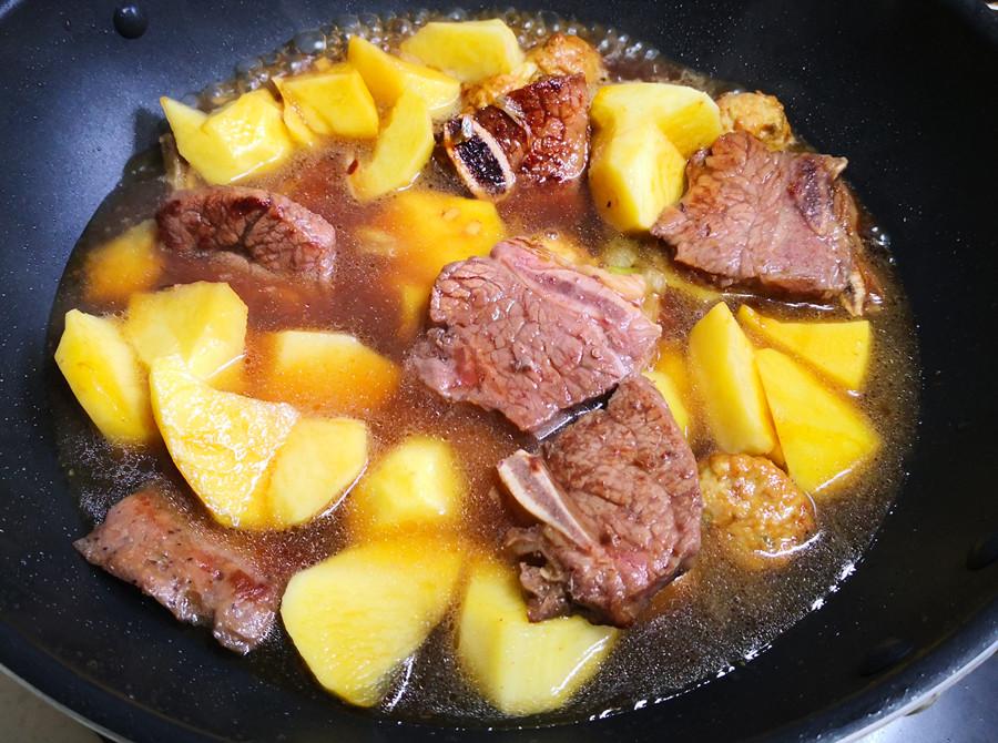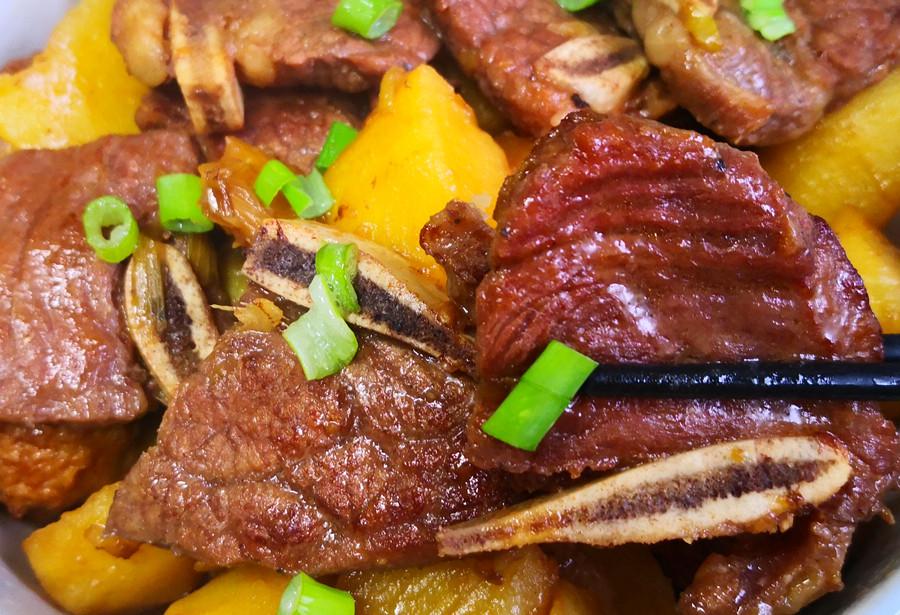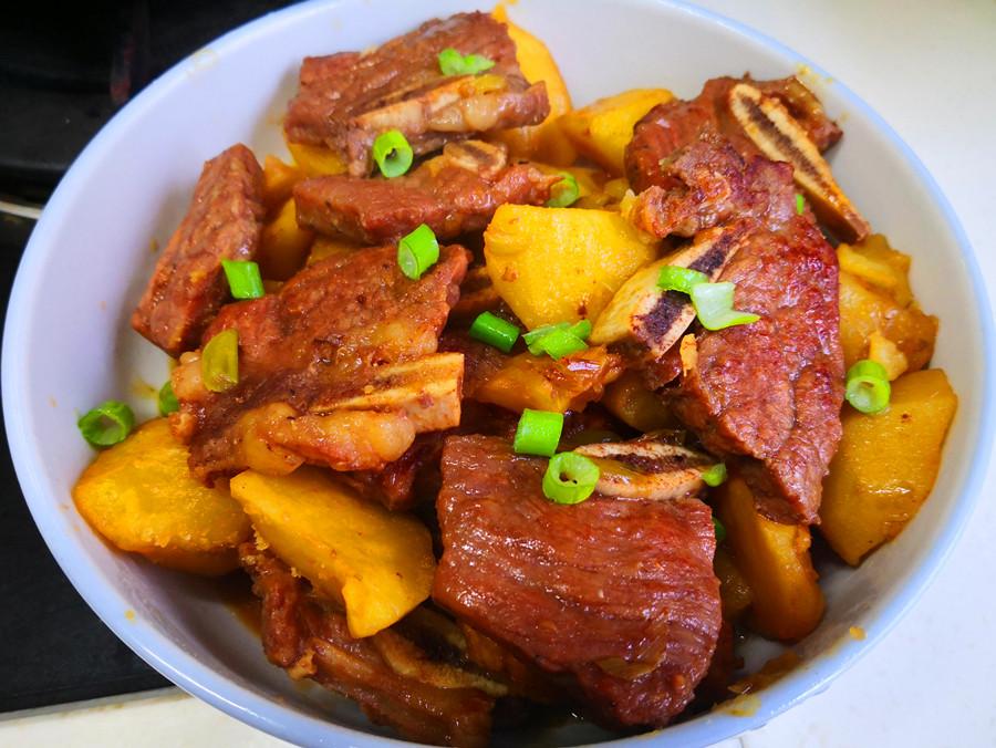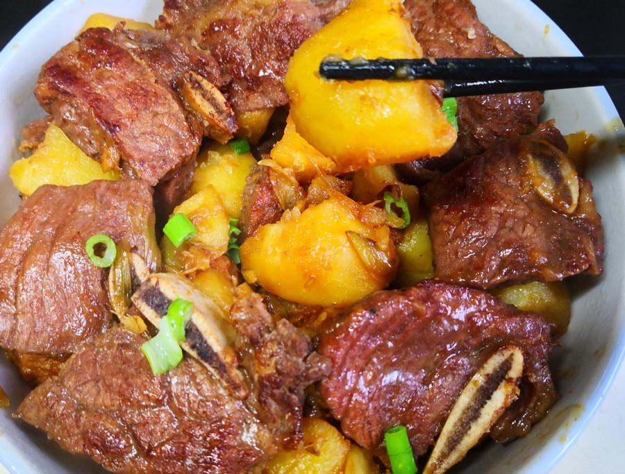 4.大約燉半個小時左右,期間可以不時地開鍋,用筷子試一下,燉至土豆和牛仔骨軟爛入味,湯汁變濃後就可以關火了,出鍋前撒上適量的蔥花提鮮,一道鮮嫩多汁、營養好喫的牛仔骨燉土豆就做好了,太香了!