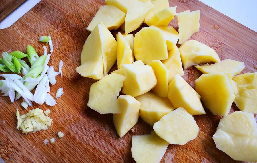 2.接着準備幾個土豆,去皮洗淨後切成滾刀塊備用;大蔥一段切蔥花;生薑一塊切成薑末備用,大蒜適量剁成蒜末備用。